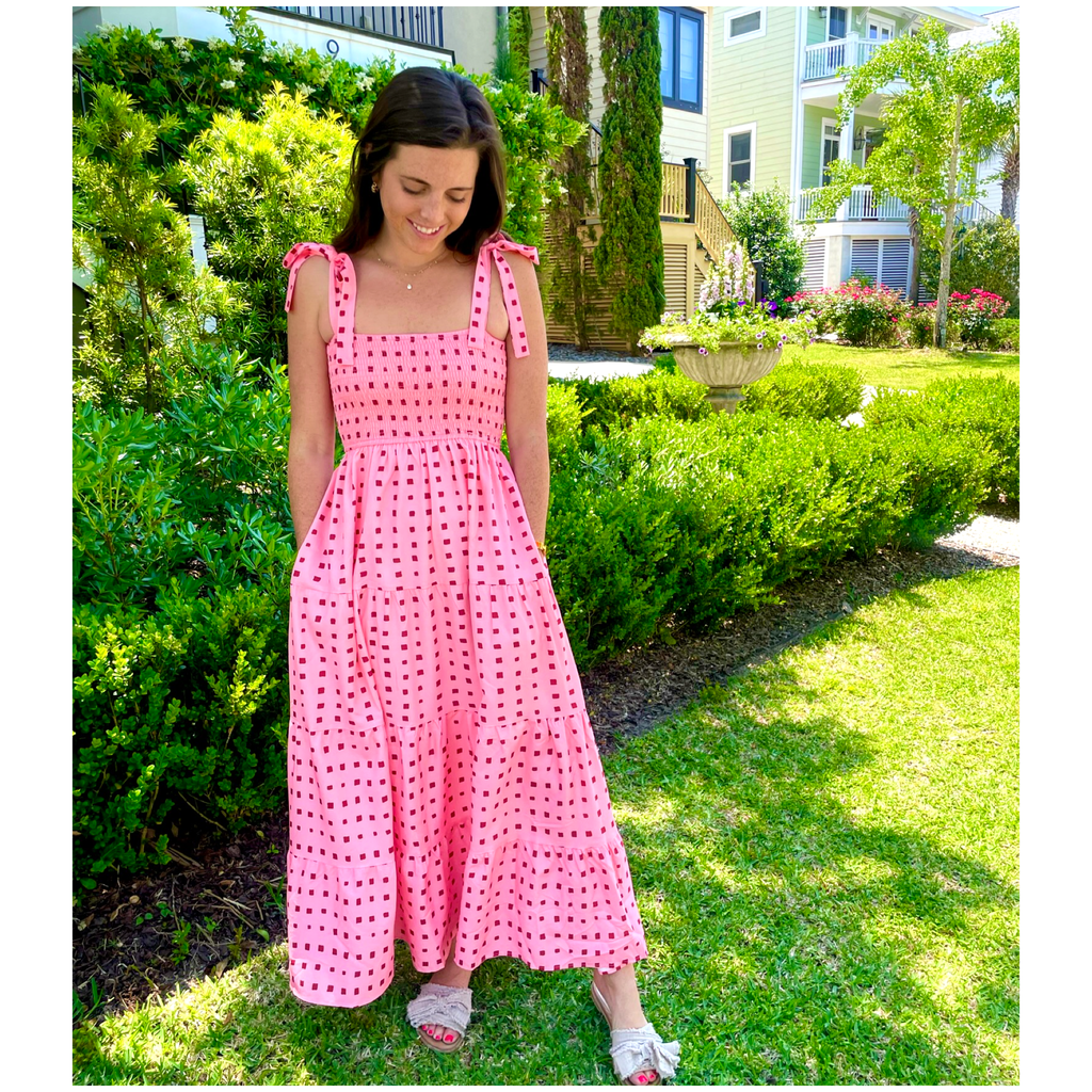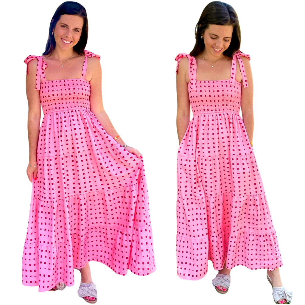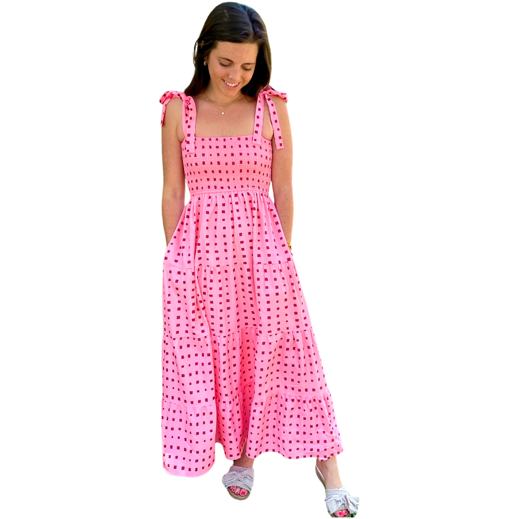 Pink & Red Smocked Tie Shoulder Blythe Dress with POCKETS
